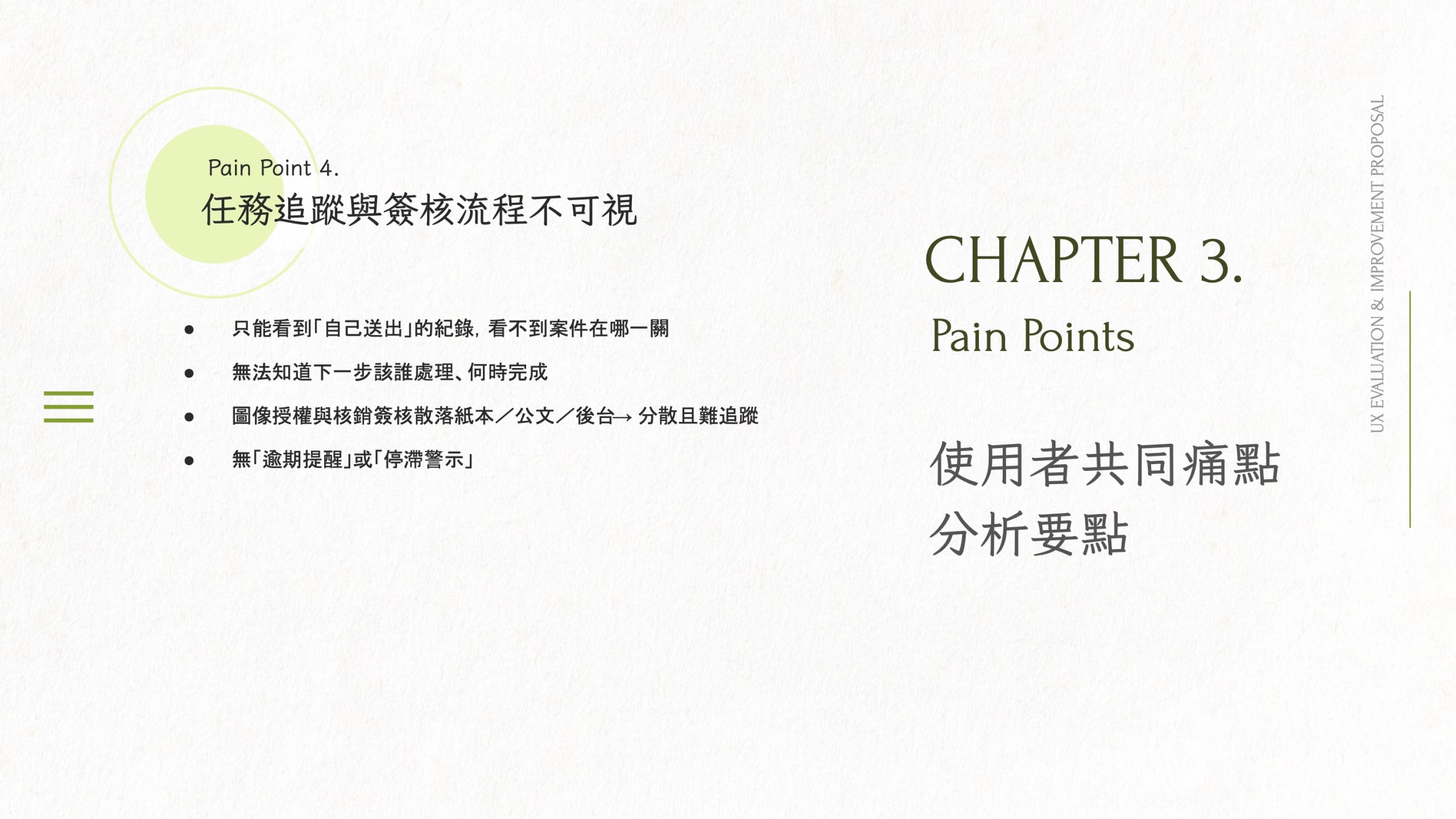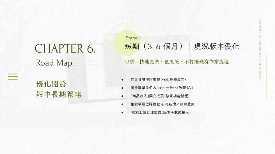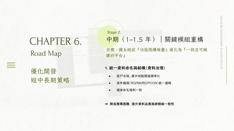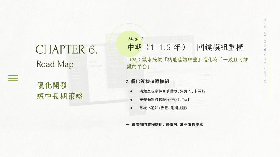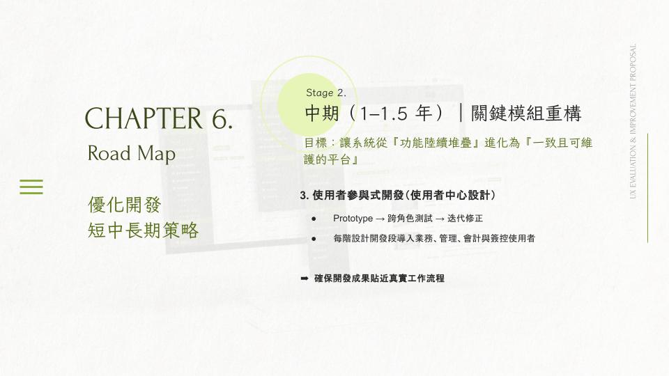 Mid-term (1–1.5 years): refactor core modules with stronger data governance, systematic approval tracking, and a participatory UCD process