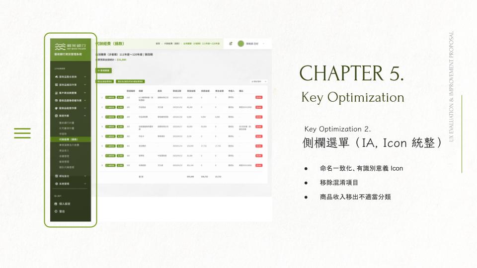 Sidebar + IA + icon system: standardized naming, improved recognizability with clearer icons, removed confusing items, and corrected misplaced categories (e.g., “product revenue”)